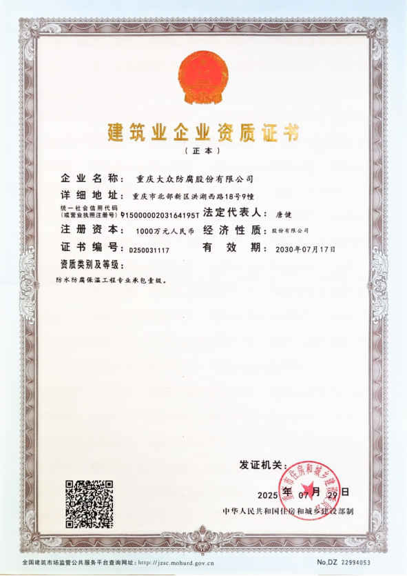 建筑业企业资质-防水防腐保温工程专业承包壹级